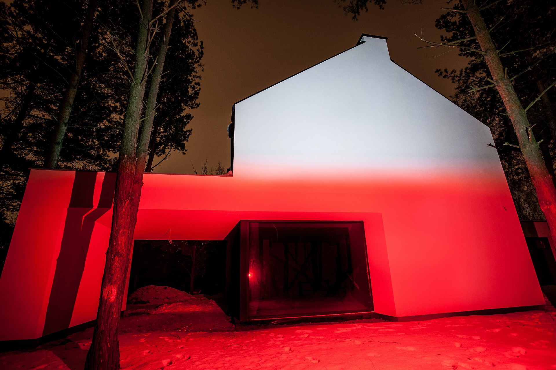 Naświetlacz LED 50 W z separowanym białym i czerwonym światłem, przeznaczony do dekoracyjnego oświetlenia elewacji budynków barwami narodowymi.