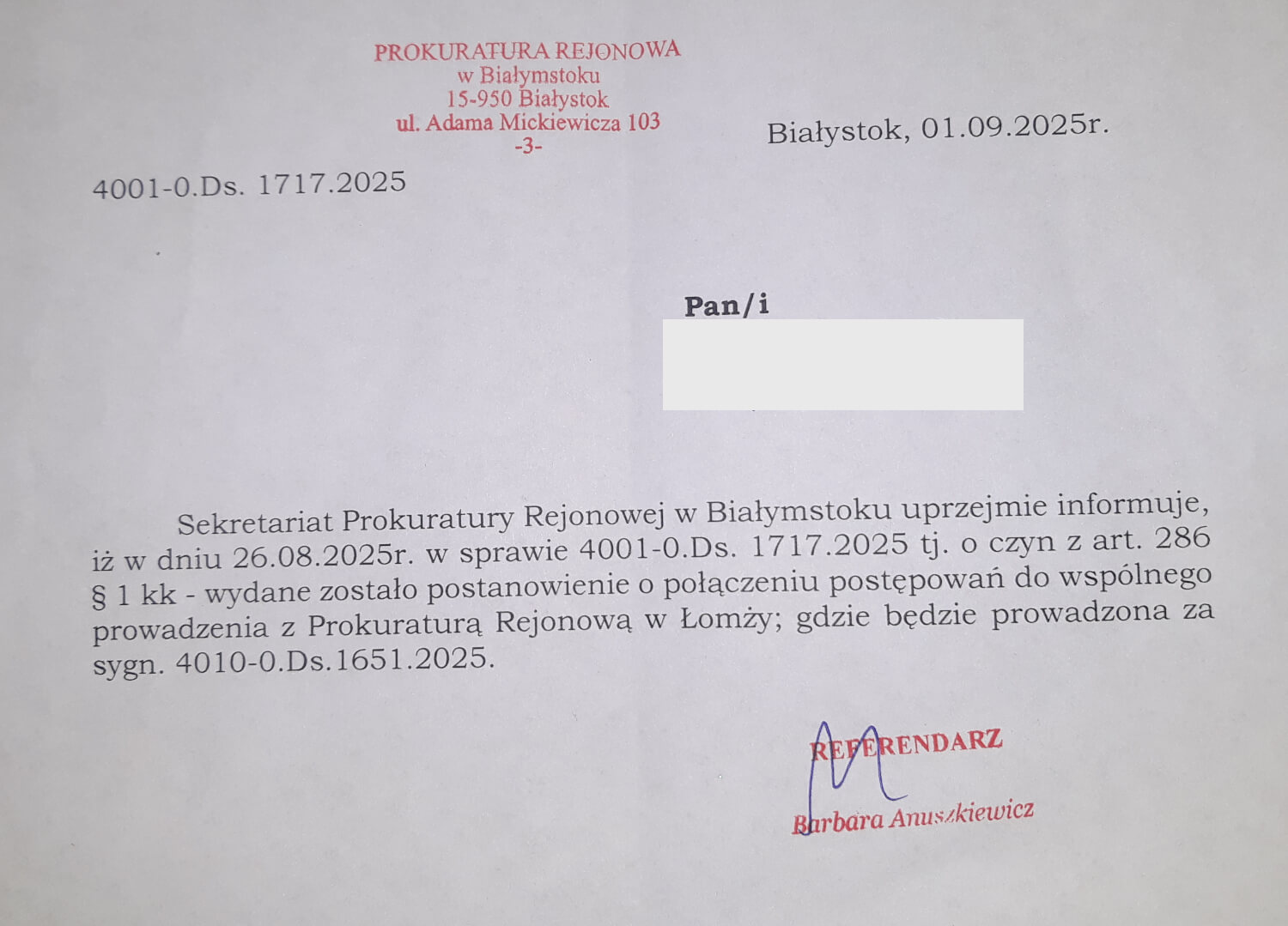 Prokuratura Regionalna w Białymstoku przychyliła się do wniosków oszukanych oraz apelu posła Jarosława Zielińskiego o wymianę informacji między prokuratorami rejonowymi i łączenie postępowań karnych.
