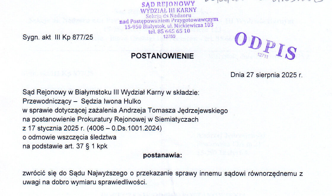 Z otrzymanych informacji wynika, że sędzia Alina D. nie jest już sędzią Sądu Rejonowego w Białymstoku.