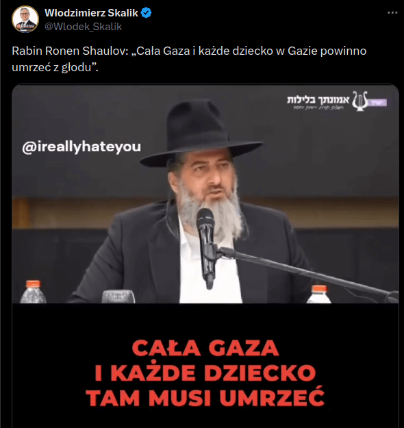 Rabin Ronen Shaulov: „Cała Gaza i każde dziecko w Gazie powinno umrzeć z głodu”