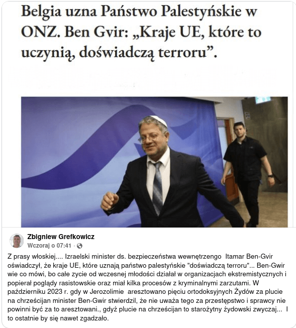 Itamar Ben-Gvir: Kraje UE, które uznają państwo palestyńskie "doświadczą terroru"