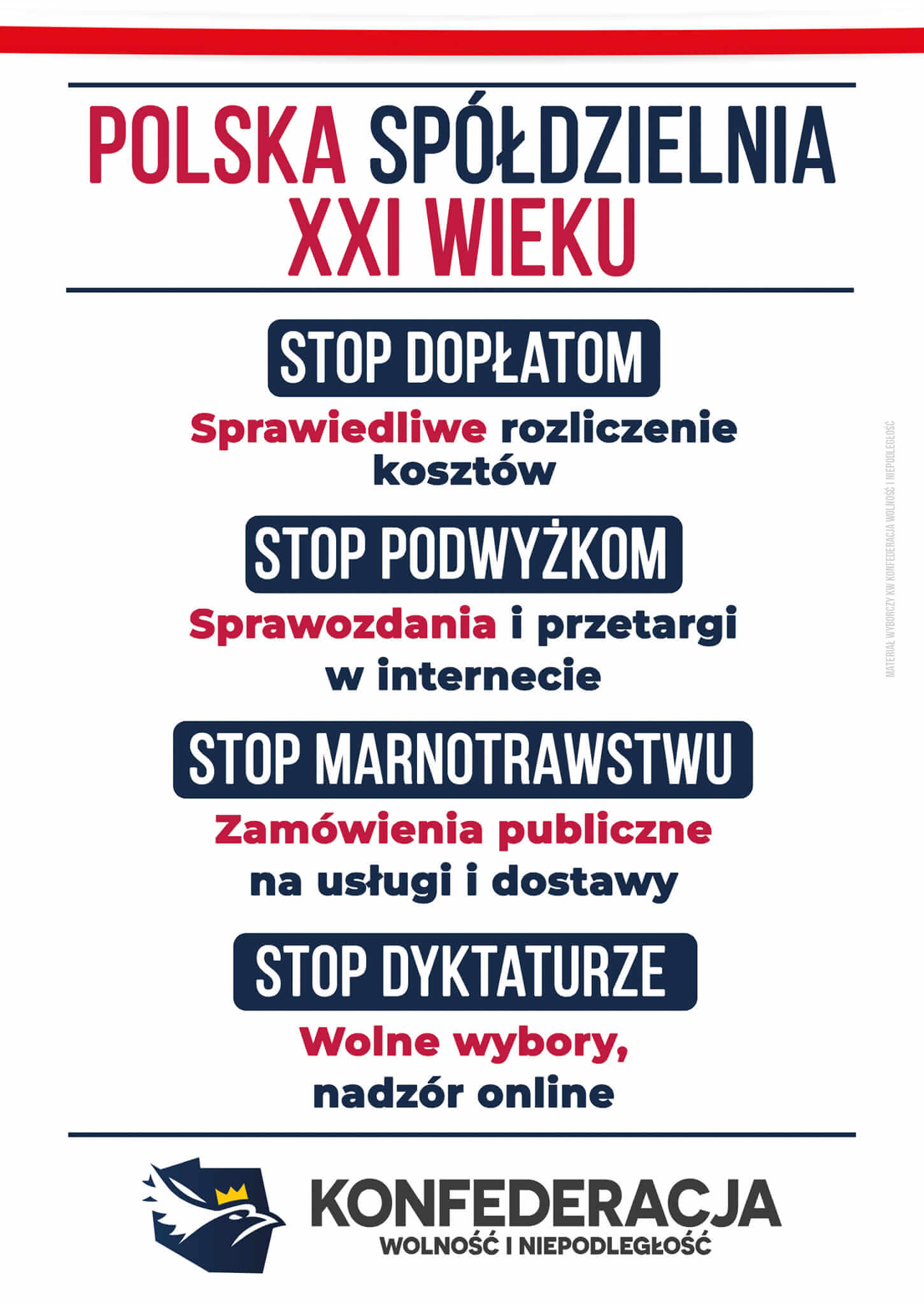 Kandydat Konfederacji kierując przekaz do mieszkańców spółdzielni, postuluje innowacyjne zmiany w spółdzielczości pod hasłem "Polska spółdzielnia XXI wieku" - w obiektywnym rozumieniu niewątpliwie korzystne dla Polski i Polaków, zważywszy na wielkość grupy społecznej, której dotyczą.