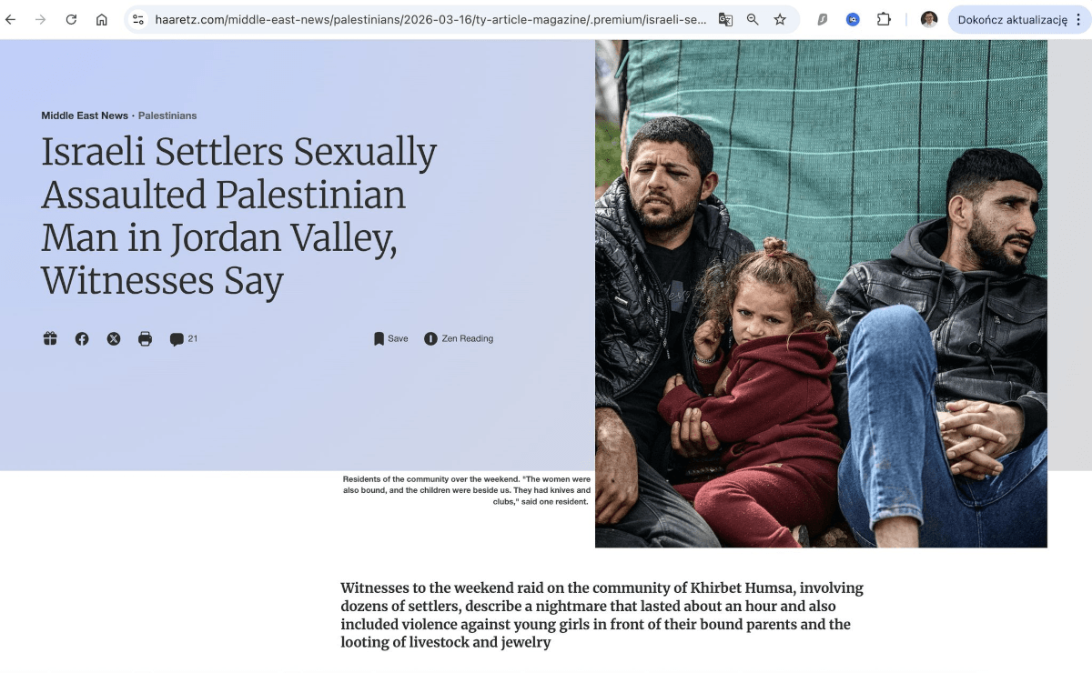 Według izraelskiego dziennika Haaretz tzw. osadnicy z Izraela (tj. Żydzi bezprawnie przejmujący ziemie i domy Palestyńczyków) gwałcą i bestialsko wykorzystują seksualnie i mężczyzn i młode dziewczyny i to na oczach rodziny. Poniżej potwierdzenie dziennika Haaretz, a takich doniesień jest wiele.