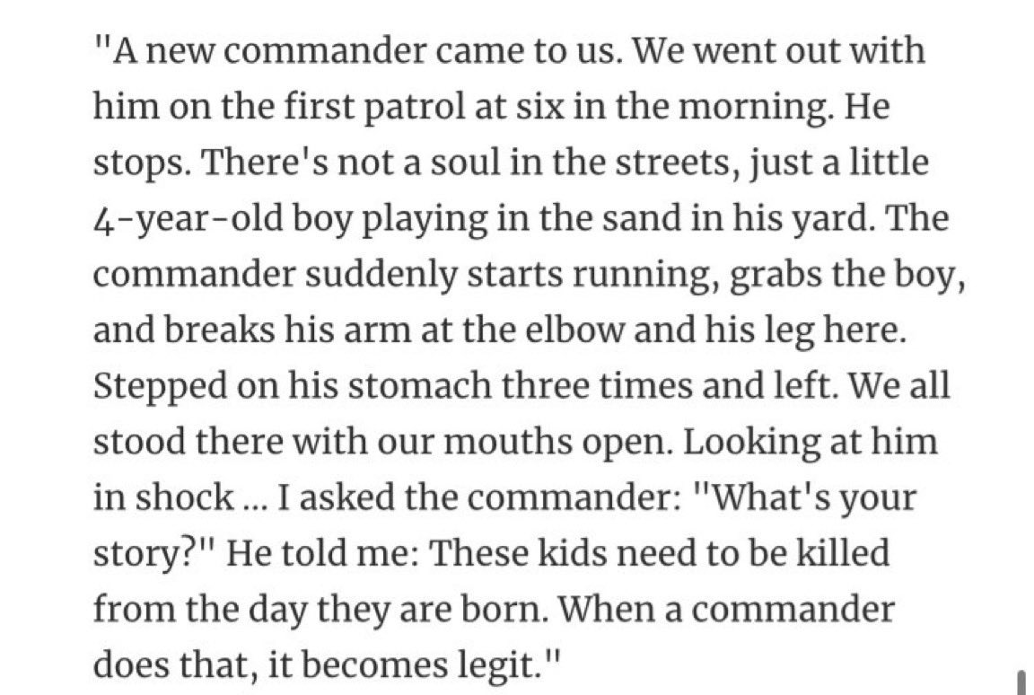 „Przyszedł do nas nowy dowódca. Wyszliśmy z nim na pierwszy patrol o szóstej rano. Zatrzymuje się. Na ulicach nie ma żywej duszy, tylko mały, 4-letni chłopiec bawiący się w piasku na swoim podwórku. Dowódca nagle zaczyna biec, łapie chłopca i łamie mu rękę w łokciu oraz nogę w tym miejscu. Nadepnął mu na brzuch trzy razy i odszedł. Wszyscy staliśmy z otwartymi ustami. Patrzyliśmy na niego w szoku... Zapytałem dowódcę: »O co ci chodzi?«. Odpowiedział mi: »Te dzieci trzeba zabijać od dnia narodzin«. Kiedy dowódca tak robi, staje się to dozwolone [nabiera to prawomocności].”