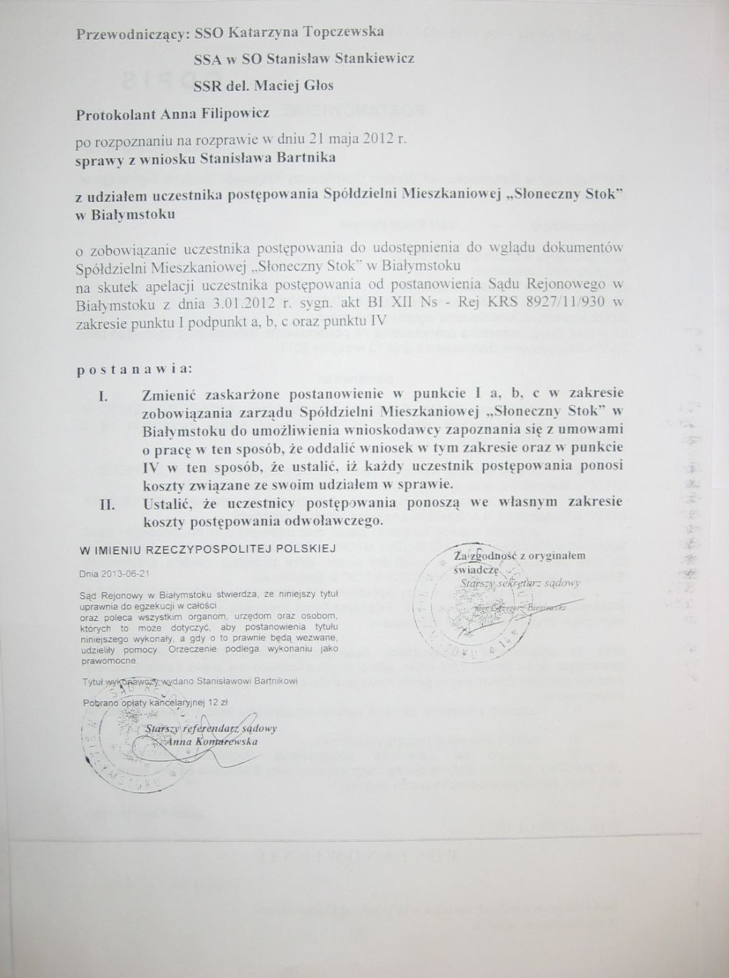 Działając w interesie publicznym prezentuję klauzulę wykonalności do orzeczenia białostockiego KRS, dotyczącego zobowiązania spółdzielni do udostępnienia faktur i umów.
