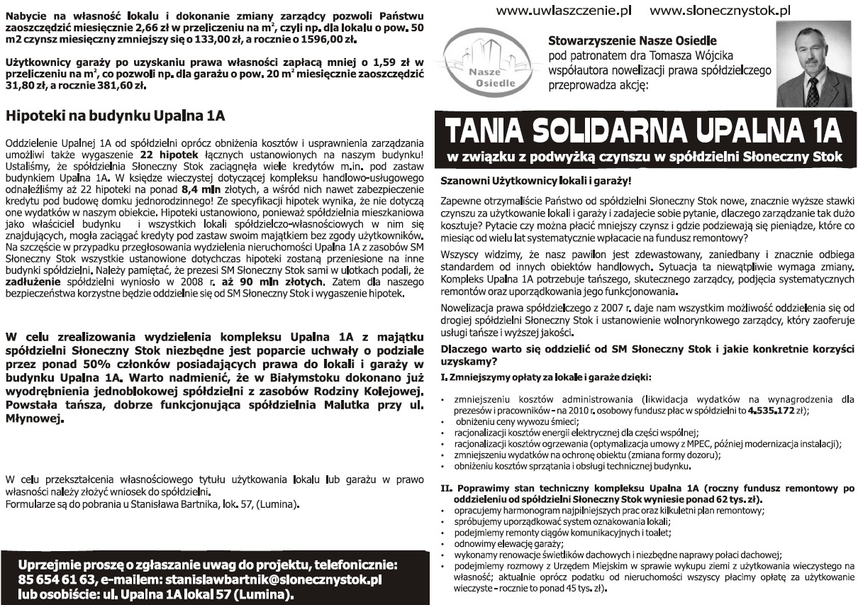 Władze spółdzielni Słoneczny Stok starają się zablokować zmianę zarządcy w nieruchomości Upalna 1A. Zarząd wniósł apelację od orzeczenia Sądu Rejonowego przyznającego wgląd w rejestr członków SM Słoneczny Stok. Zobacz orzeczenie: http://slonecznystok.pl/wyroki/523-postanowienie-biaostockiego-sdu-ws-udostpnienia-faktur-i-umow-.html